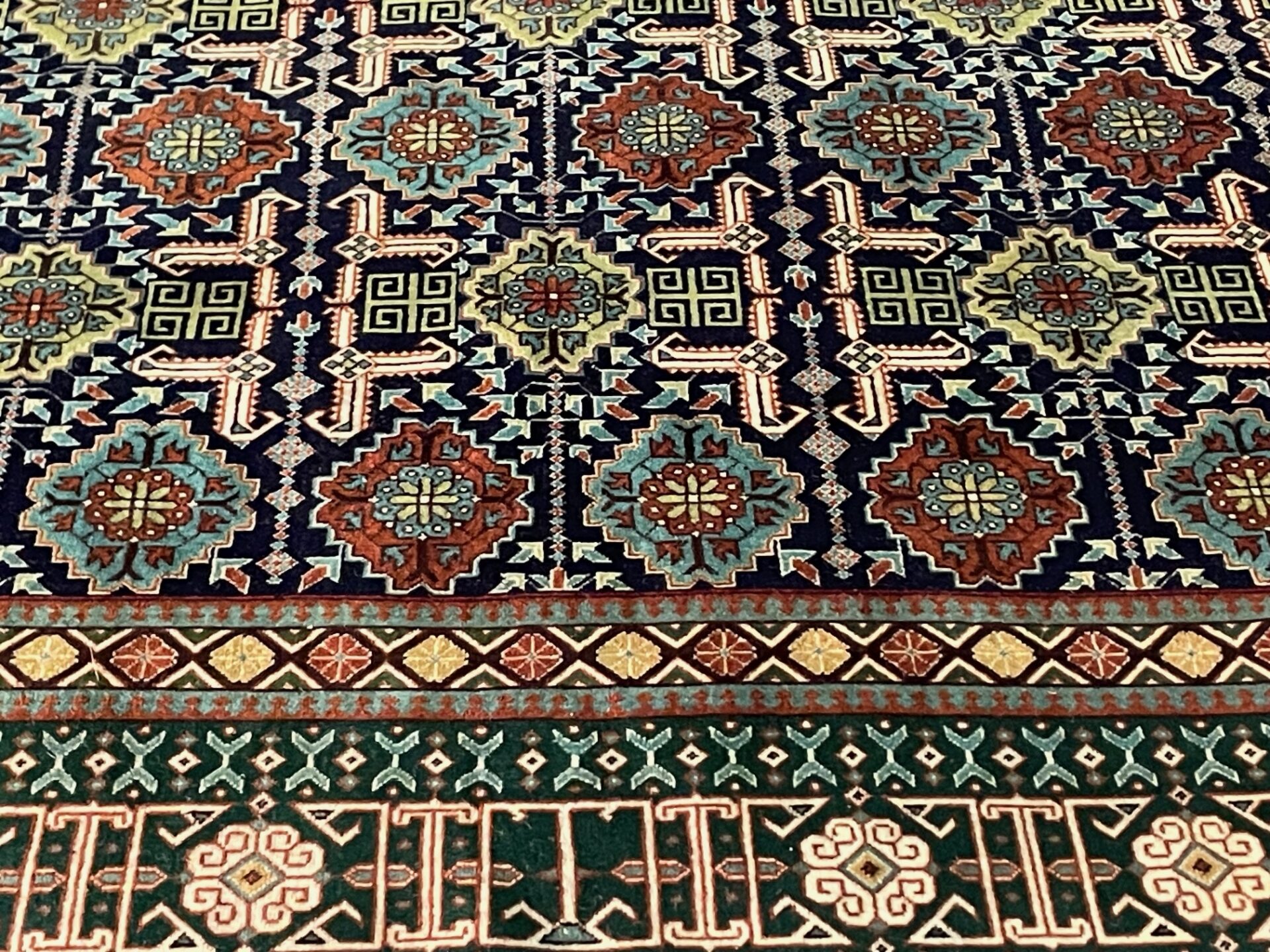 The weavings of tribal nomads today are most similar to what the earliest rugs would have looked like. Typically, they feature only a few dark hues and simple, geometric motifs. The patterns generally identify ethnic groups or even clans or families. One family—even one person—may have sheared the sheep, dyed the wool and woven the rug. Tribal rugs have an honest, charming quality. Wool pile and foundation are common, although cotton foundation is seen on more recently produced pieces. Goat and camel hair are also sometimes employed. Silk—expensive and impractical to obtain—is almost never used. Carpets larger than 7’x10’ are rare (they’re too heavy and difficult to haul around). Although some nomads remain in Iran, many tribespeople have settled in villages. The rugs they produce are distinct from those of their nomadic relatives.